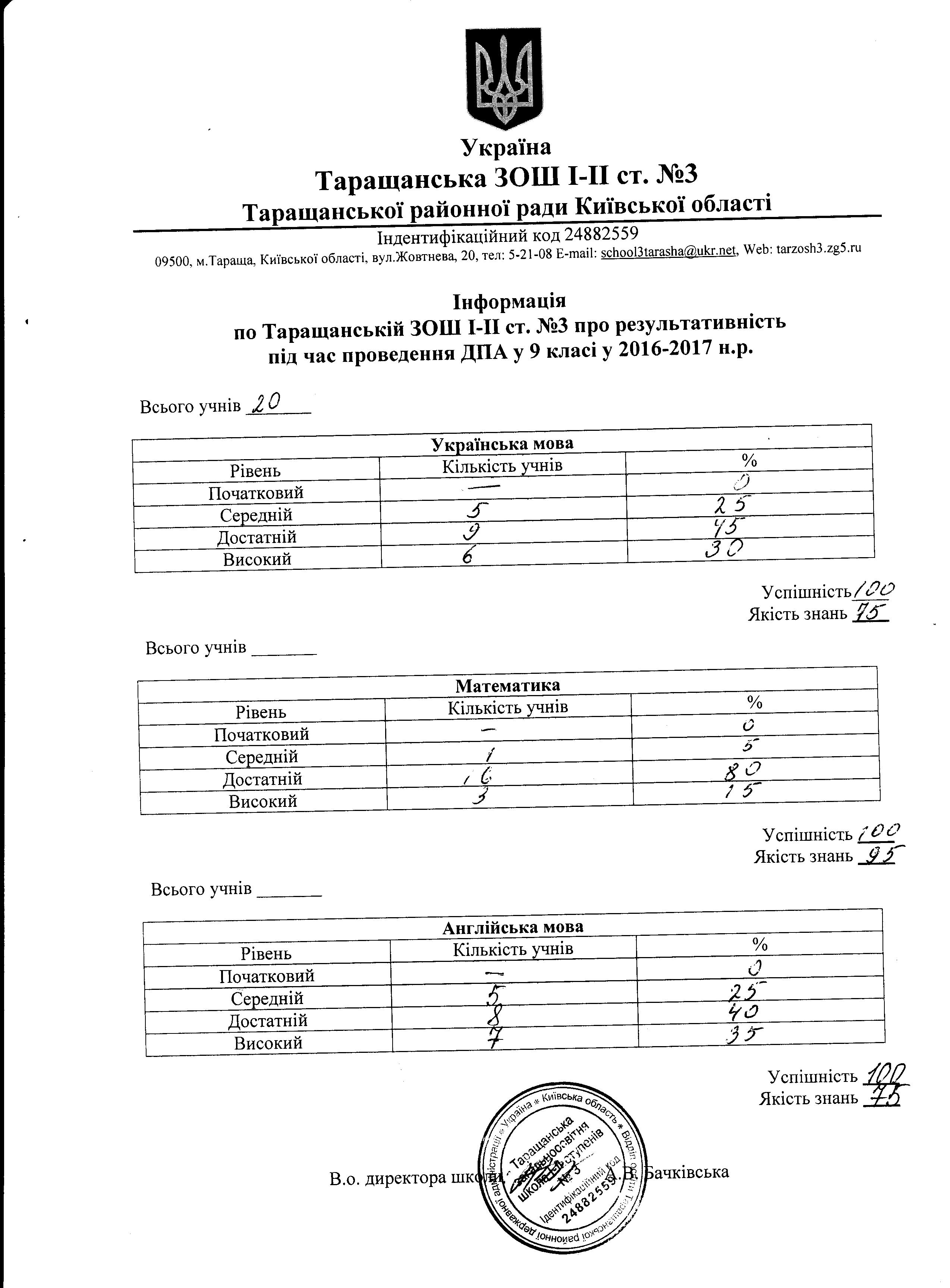 Директор ЗЗСО: Л.Коваленко